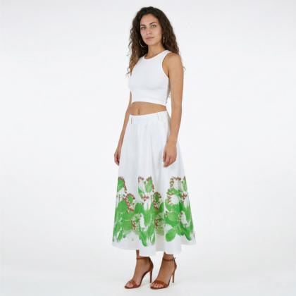 Gonna sartoriale realizzata in lino 100% di alta qualità. Splendida stampa all-over con fichi d'India esotici. Lunghezza midi con elastico in vita. Realizzata su misura, serigrafata a mano, made in Italy.