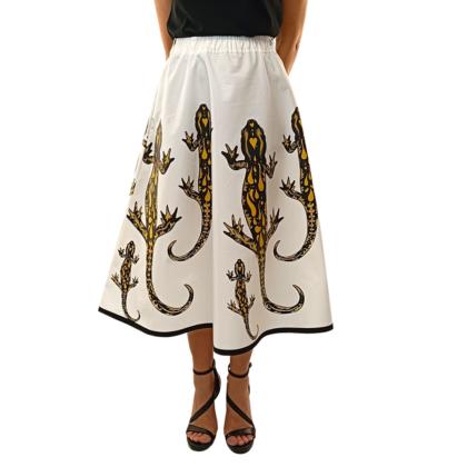 Gonna sartoriale realizzata in cotone 100% di alta qualità. Splendida stampa di salamandre all-over. Lunghezza midi con elastico in vita. Realizzata su misura, serigrafata a mano, made in Italy.