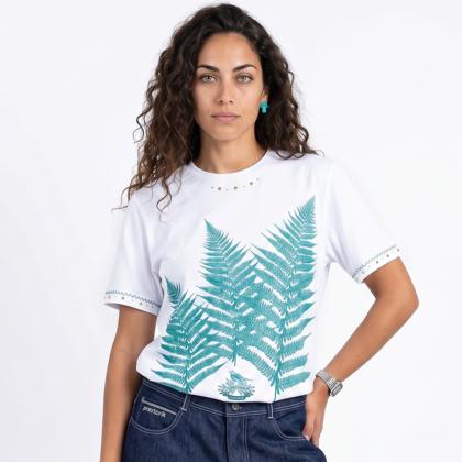 T-shirt da donna in 100% cotone biologico, serigrafia realizzata a mano, borchie metalliche su maniche e colletto. Vestibilità comoda. Interamente prodotta in Italia.