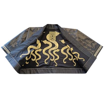Giacca kimono corta in denim nero con fodera in popeline di cotone stampato 100%. Ricamo a foglie lungo le maniche e l'orlo. Serigrafia artigianale che imita la pelle di vipera. Made in Italy.