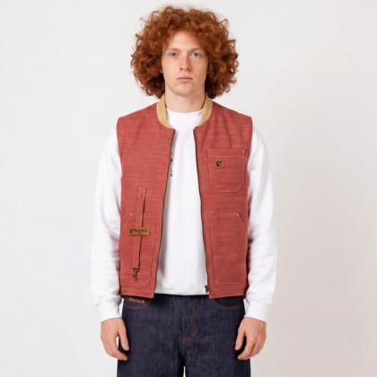 A comfortable and stylish vest inspired by rural lumberjack life. It guarantees protection and practicality thanks to the durable fur-lined denim, three exterior pockets, and one interior pocket. It also features a discreetly placed keychain-saving carabiner on the right front pocket, which can be hidden through a special hole.